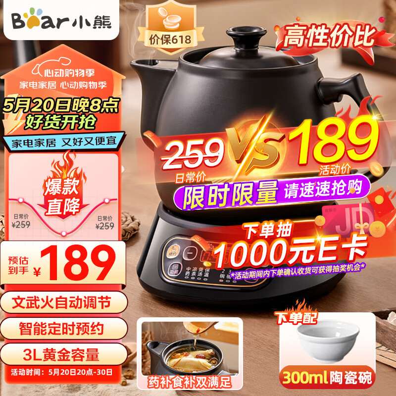 小熊(Bear)煎药壶 中药壶 中药锅 熬药电砂锅 养生壶中药煲3升大容量分体式陶瓷全自动智能家用 JYH-A30A1价格:189.00元!
