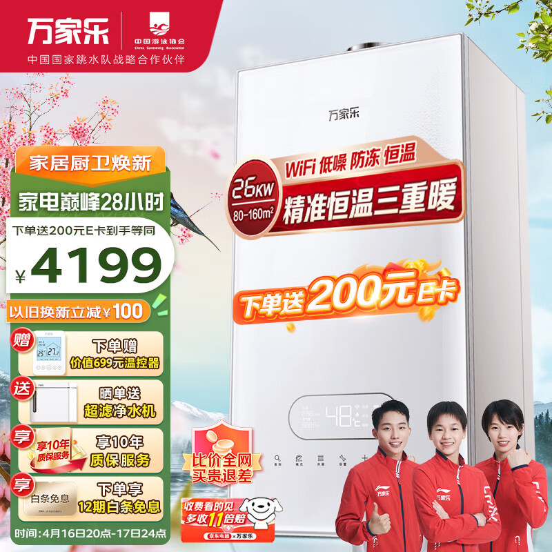 万家乐壁挂炉 洗浴采暖两用 燃气热水器 暖气片地暖 小体积 玻璃屏 三段燃烧26KW天然气BW3【80-160平】价格:4399.00元!