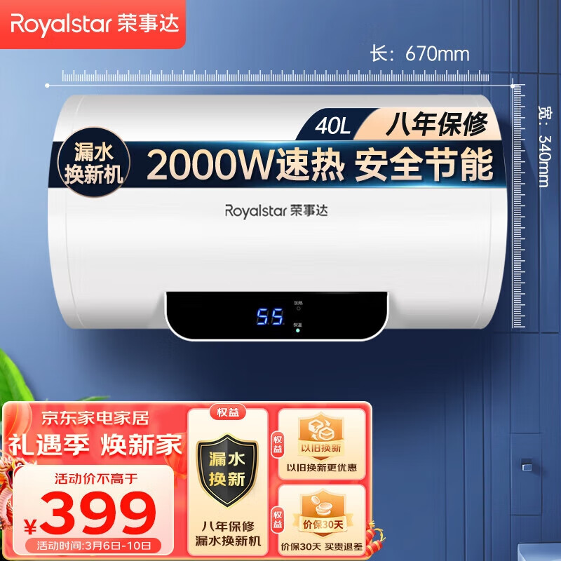 荣事达(Royalstar)40升储水式电热水器家用快速热水器卫生间洗澡小户型节能 双重防护RSD-CZB40T价格:399.00元!