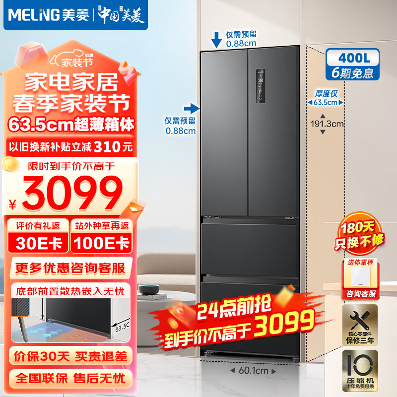 美菱(MeiLing)冰箱400升法式双开门冰箱对开门家用一级能效零嵌入式超薄601mm窄箱体风冷无霜底部散热四门电冰箱 【无忧嵌】 BCD-400WP9CZX-灰价格:3049.00元!