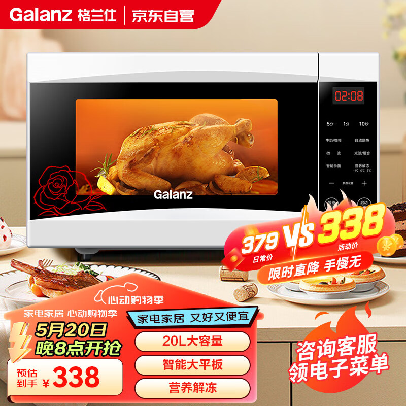 格兰仕智能家用微波炉 平板速热光波炉 微烤一体 700W 20升容量 白色 G70F20CP-D2(S0)价格:338.00元!