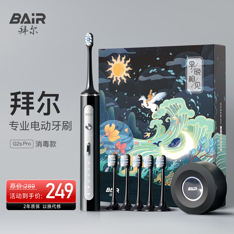 拜尔(BAIR)G2 Pro 高端消毒旗舰机 电动牙刷成人震动充电智能声波学生情侣全自动男士女送朋友礼物 礼盒装 魅力黑【G2s Pro 灭菌款】价格:289.00元!