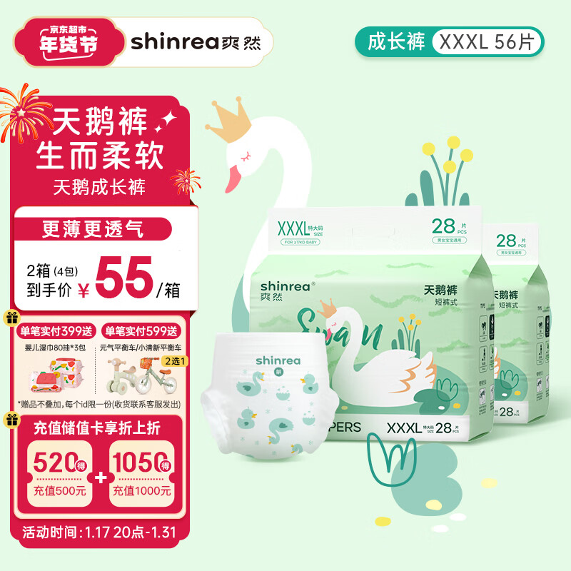 爽然(shinrea)天鹅系列拉拉裤XXXL56片超薄男女通用婴儿尿不湿价格:100.00元!