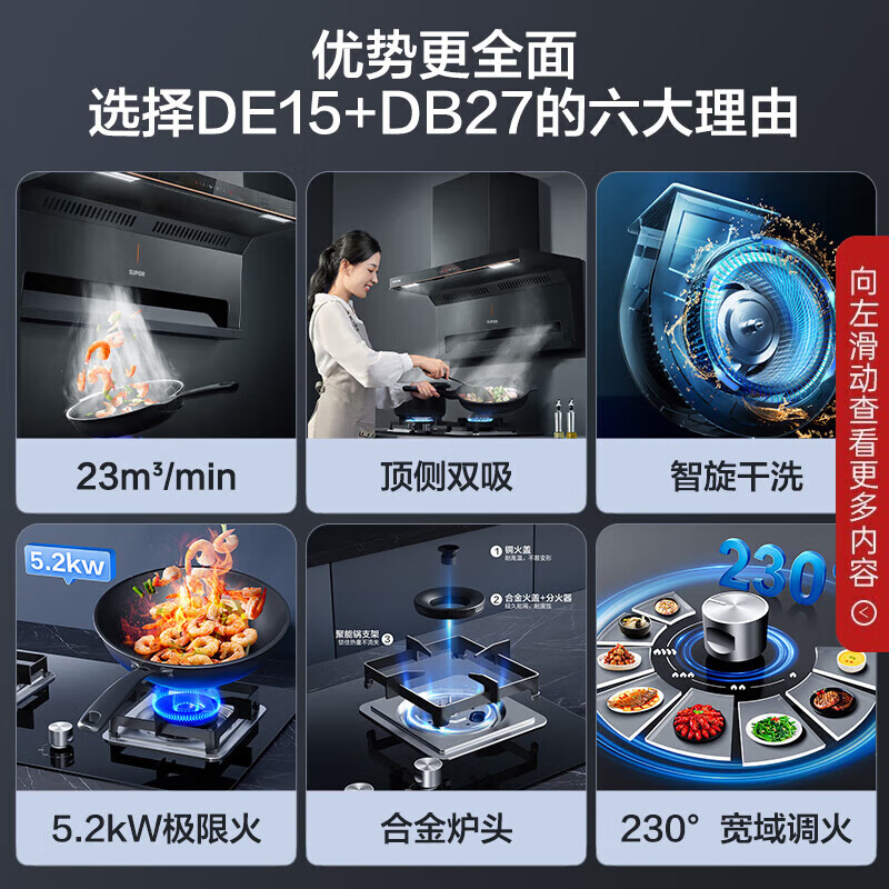 苏泊尔(SUPOR) 抽油烟机 顶侧双吸7字型烟灶套装23立方挥手免拆洗家用烟机燃气灶具套装DE15+DB27天然气价格:1946.00元!
