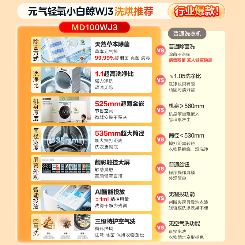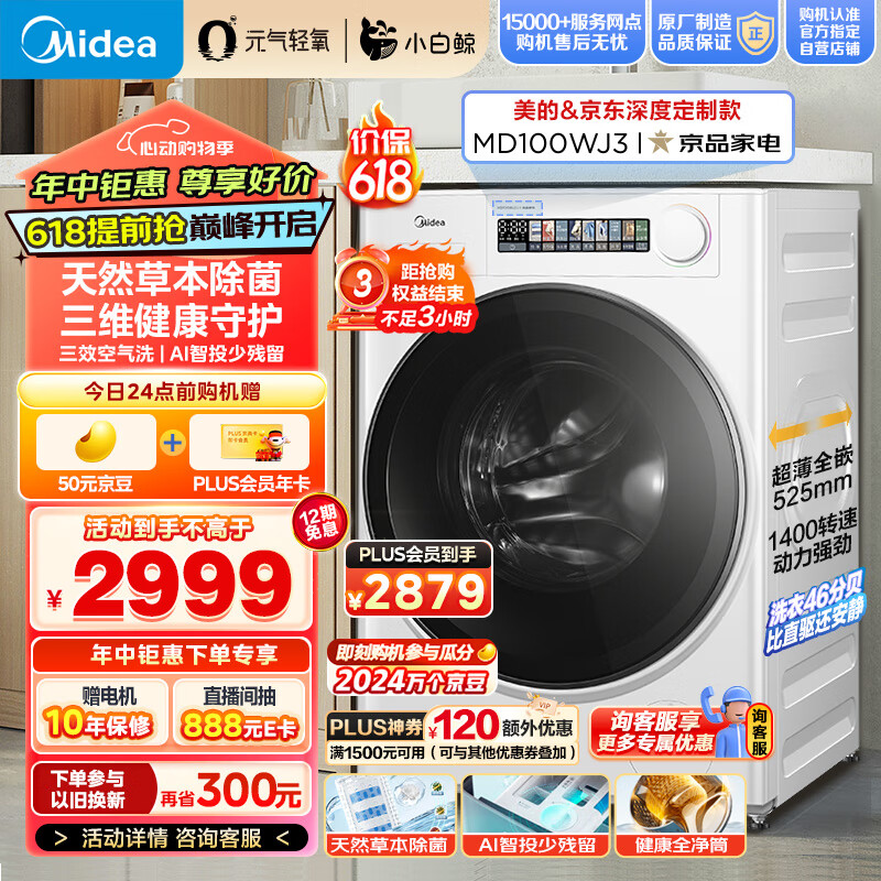 美的(Midea)滚筒洗衣机全自动 元气轻氧系列 小白鲸 MD100WJ3 10公斤洗烘一体机 草本除菌 1.1洗净比 超薄全嵌价格:2999.00元!