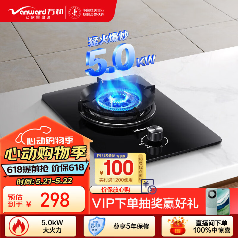 万和(Vanward)钢化玻璃燃气灶单灶具 单眼灶嵌入式 5.0kW大火力 台嵌两用煤气炉煤气灶 JZY-E6L90 液化气价格:298.00元!