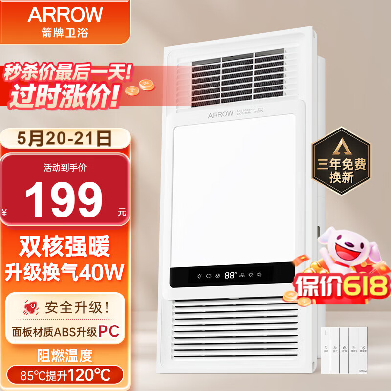 箭牌(ARROW)风暖浴霸 双核浴室取暖器 卫生间排气扇照明一体暖风机 集成吊顶价格:229.00元!