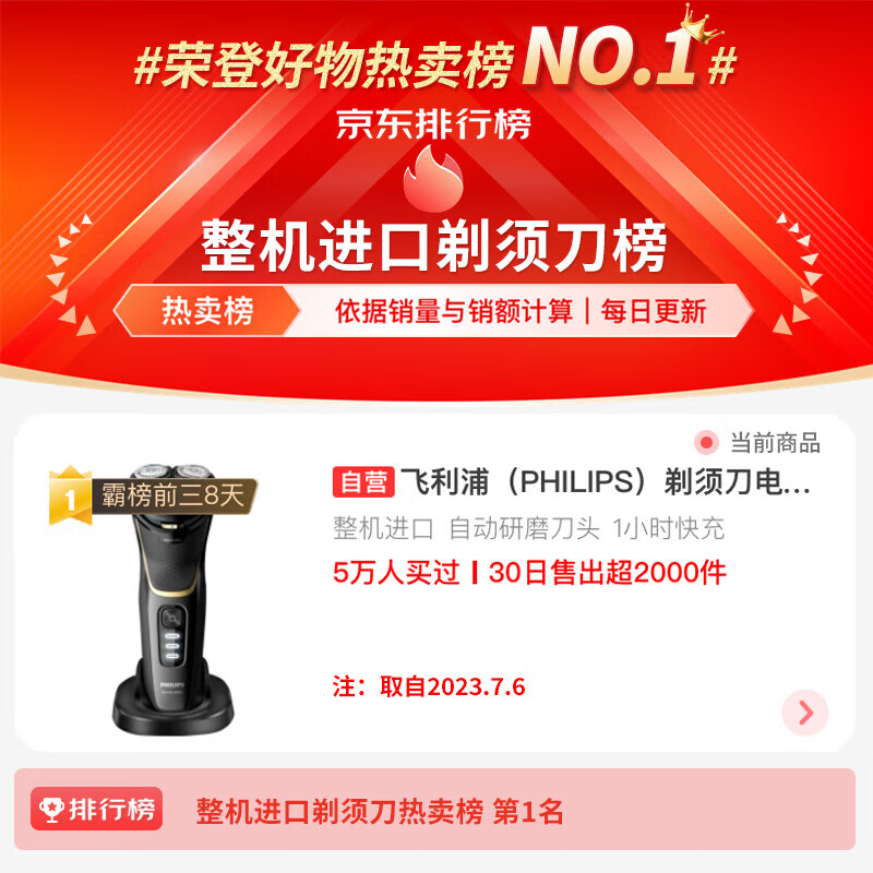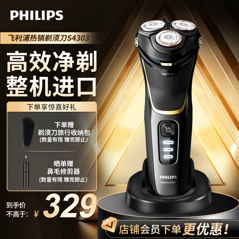飞利浦(PHILIPS)剃须刀电动高端刮胡刀 全身水洗1小时快充整机进口胡须刀 男士生日礼物送男友送老公送父亲 S4303/12 普通装价格:499.00元!
