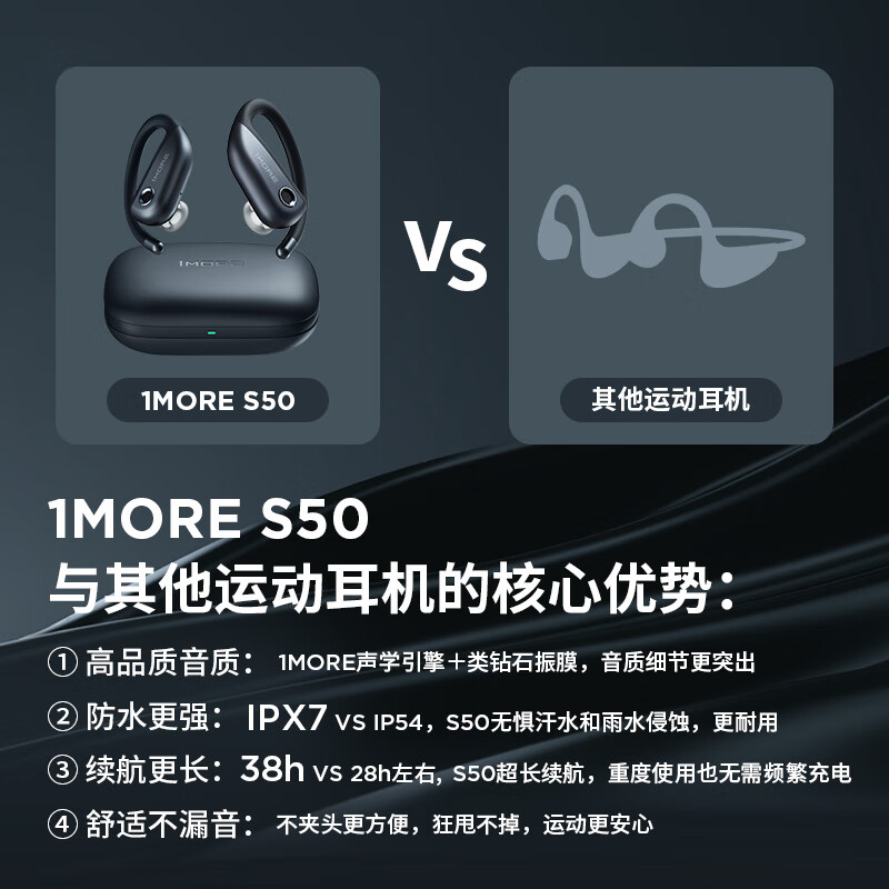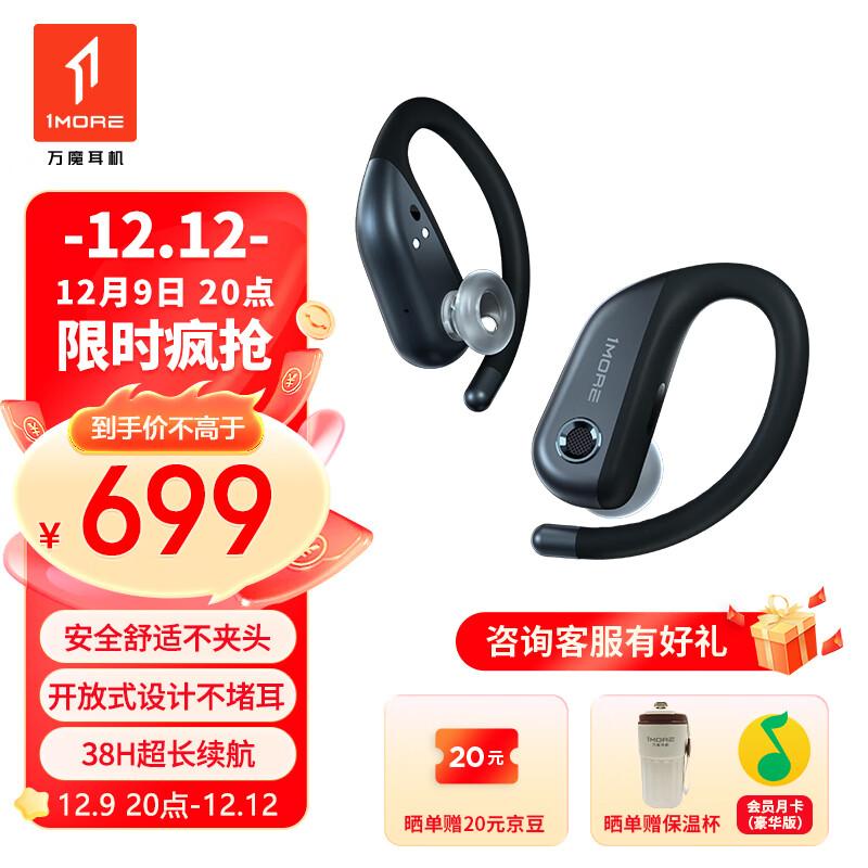 万魔(1MORE)开放式蓝牙耳机 不入耳挂耳式运动耳机 定向传声设计 长续航智能通话降噪S50 星空灰 周杰伦代言价格:799.00元!