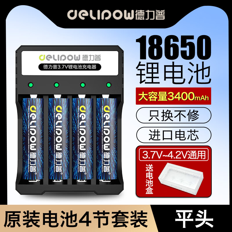 德力普(Delipow)18650锂电池大容量3400毫安强光手电筒专用电池充电器套装麦克风/头灯/航模/小风扇3.7V-4.2V通用价格:108.90元!