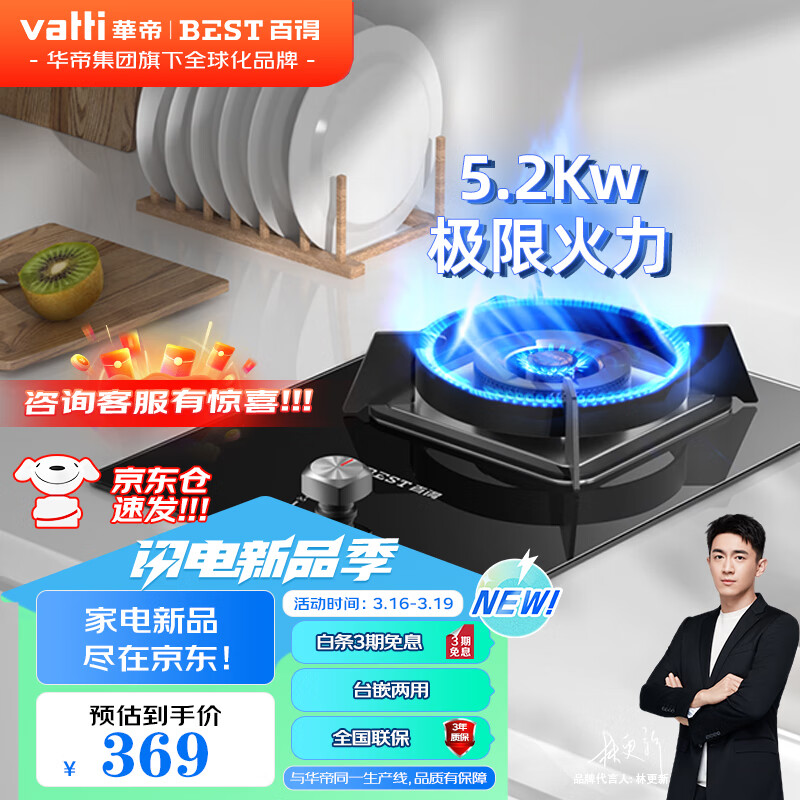 百得(BEST)华帝燃气灶 5.2kW家用大火力灶具台式嵌入式两用单灶台一级能效 QE03 天然气价格:399.00元!