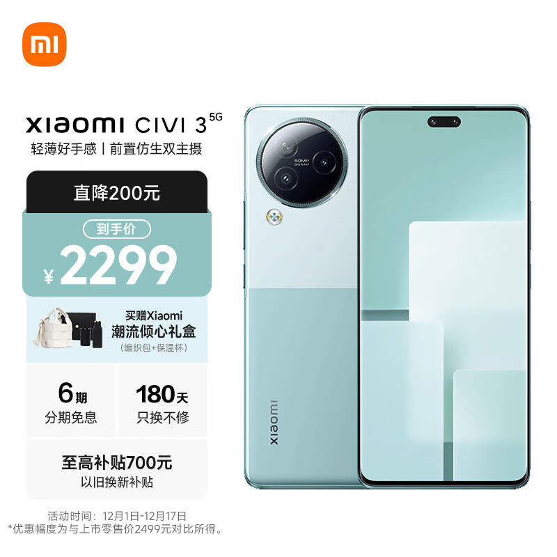 小米 Civi 3 前置仿生双主摄 天玑8200-Ultra 后置5000万光学防抖镜头 12GB+256GB 薄荷绿 小米手机 5G手机价格:2299.00元!
