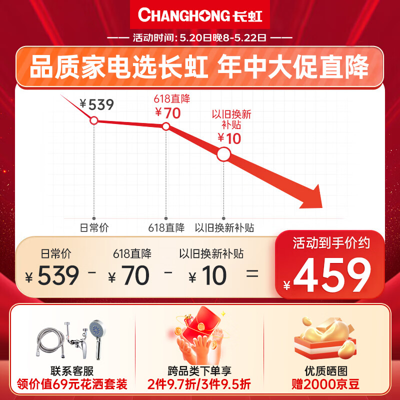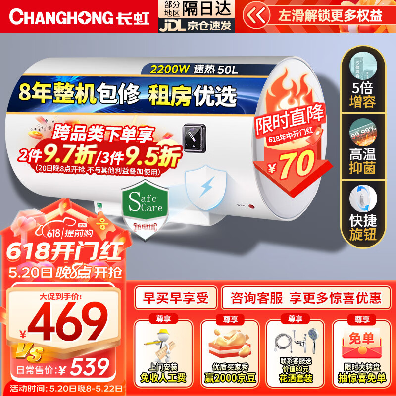 长虹(CHANGHONG)50升电热水器家用五倍增容2.2KW大功率速热节能保温小巧易操控抗腐耐用双重防漏电Y50J01价格:499.00元!
