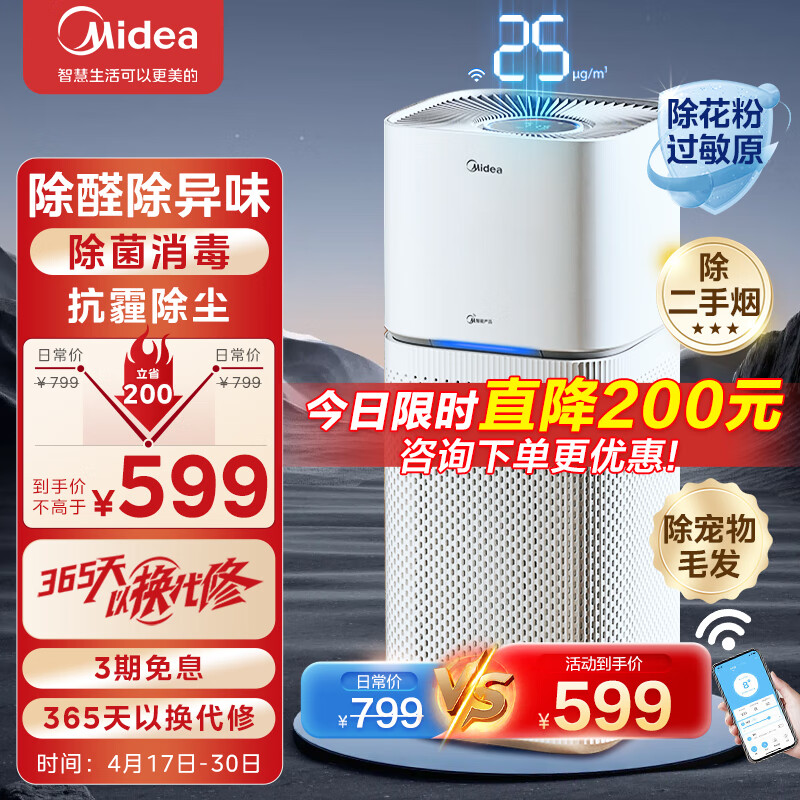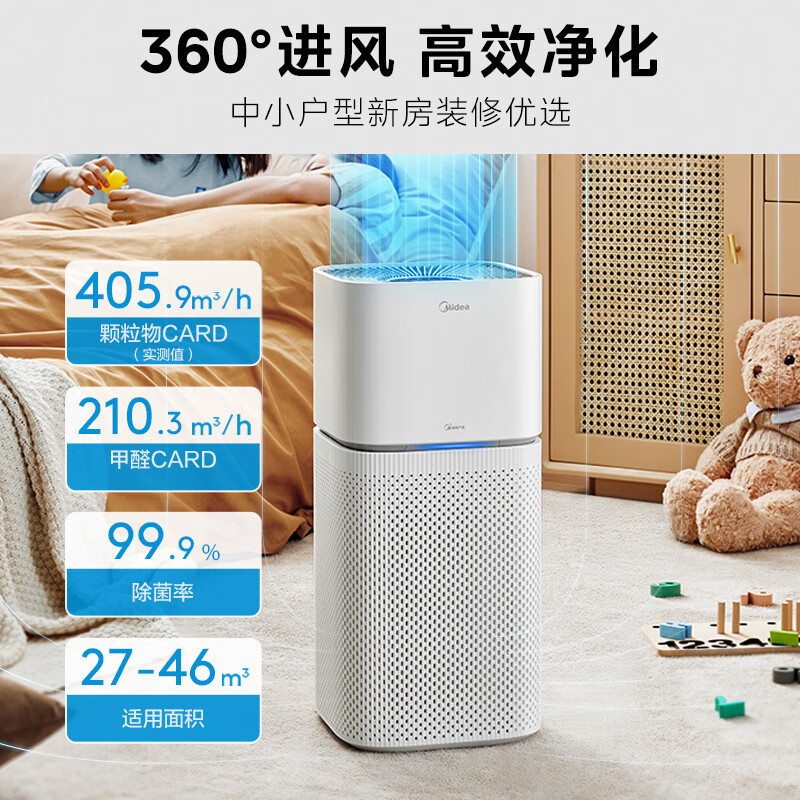 美的(Midea)空气净化器 除甲醛除菌消毒除异味除二手烟除花粉过敏原 吸猫毛宠物净化器 家用新风机轻音设计 【净化除醛】价格:799.00元!