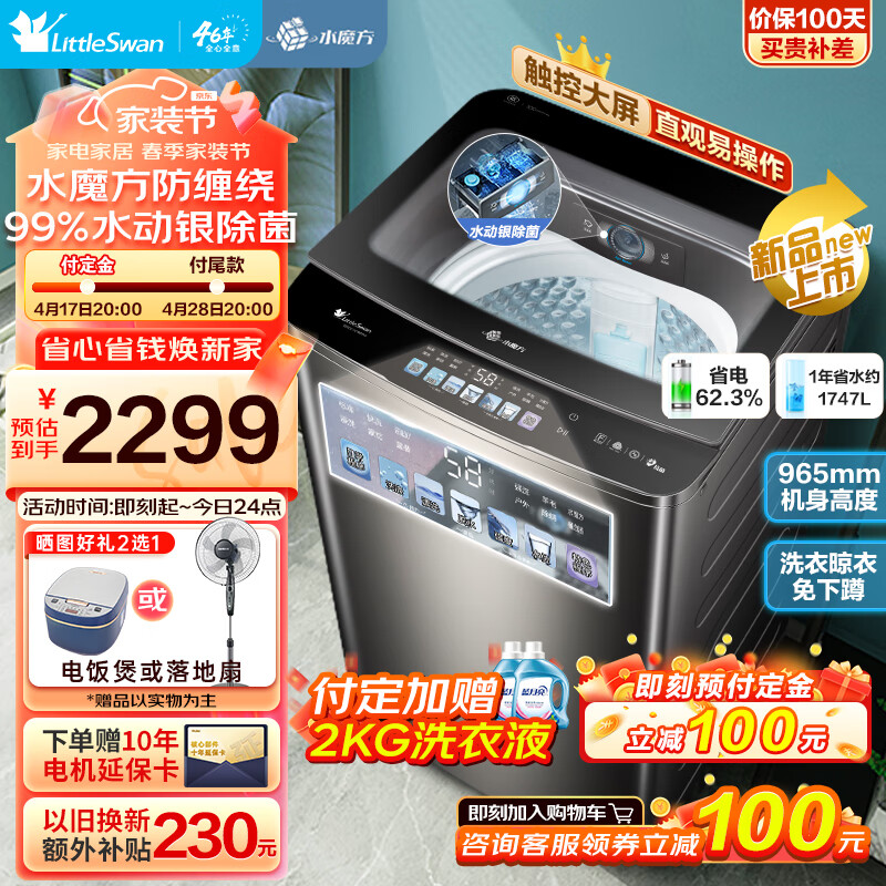 小天鹅(LittleSwan)波轮洗衣机全自动 10公斤大容量 水魔方防缠绕 直驱变频 水动银除菌 双重抗菌防污染 TB100VC18PRO价格:2398.00元!