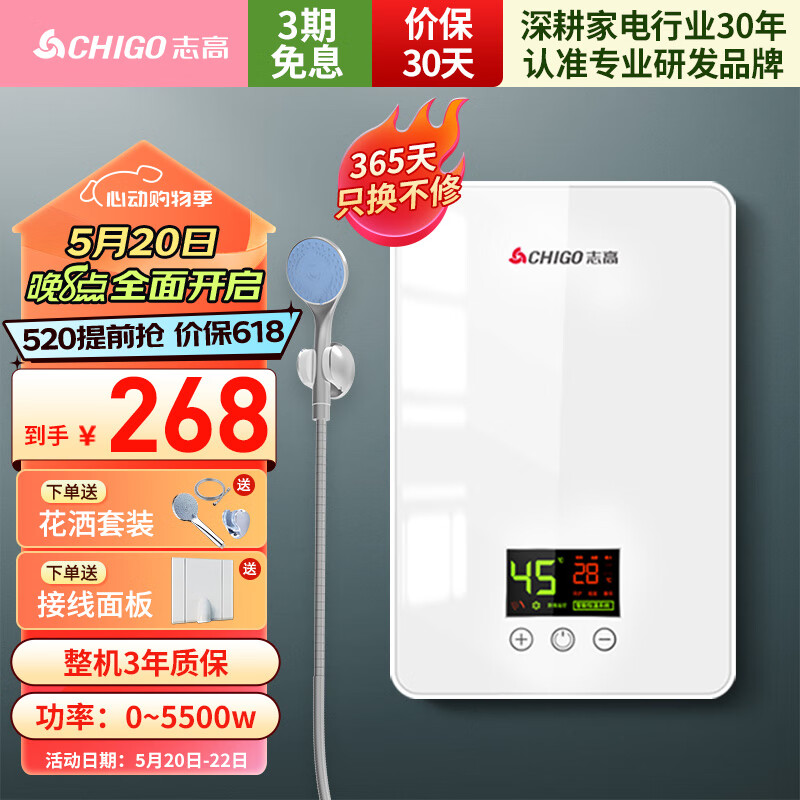 志高(CHIGO)即热式电热水器5500W快热式小厨宝 变频恒温 即热热水器快速即热 功率可调节 ZG-KB510价格:288.00元!