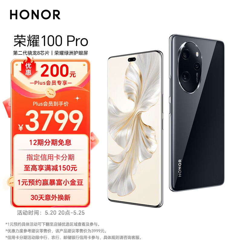 荣耀100 Pro 单反级主摄 荣耀绿洲护眼屏 第二代骁龙8旗舰芯片 AI手机 16+512 亮黑色 5G价格:3899.00元!