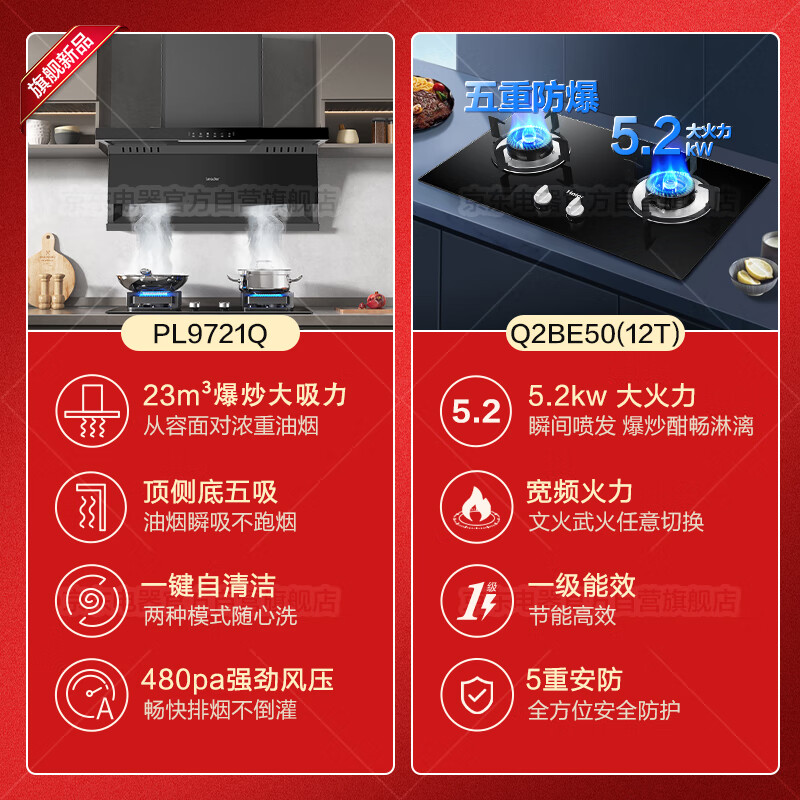 海尔(Haier)智家出品抽油烟机燃气灶套装 7字型挥手智控 23m3大吸力吸油烟机家用PL9721Q烟灶套装5.2KW灶价格:2399.00元!