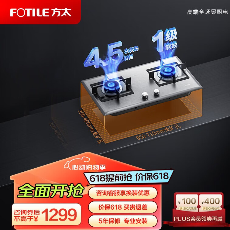 方太燃气灶(天然气)家用嵌入式不锈钢灶具 4.5kW*大火力双灶头 换装不改孔 TH25G价格:1399.00元!