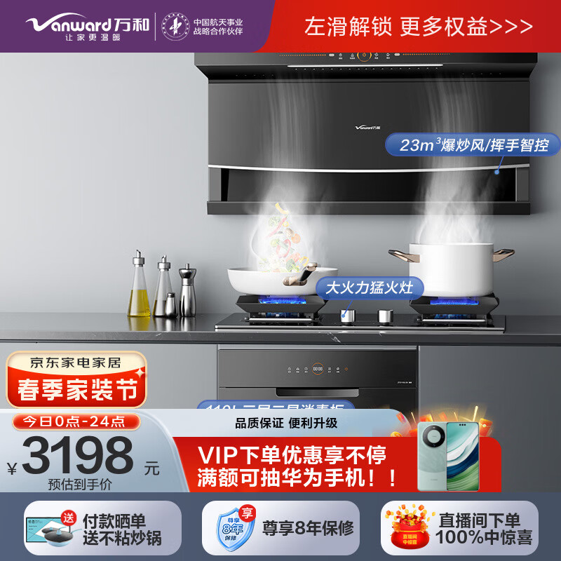 万和(Vanward)烟灶消三件套 顶侧双吸7字型大吸力油烟机燃气灶具消毒柜套装WL856+C5L90S+ZTD110Q-D8(天然气)价格:3398.00元!