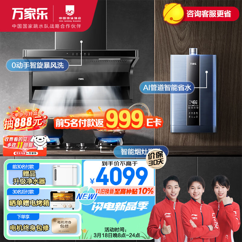 万家乐 烟灶热三件套装 顶侧双吸油烟机 23m3/min烟灶联动紫外线杀菌18L零冷水烟AK6+KV063B+18RL6天然气价格:4199.00元!