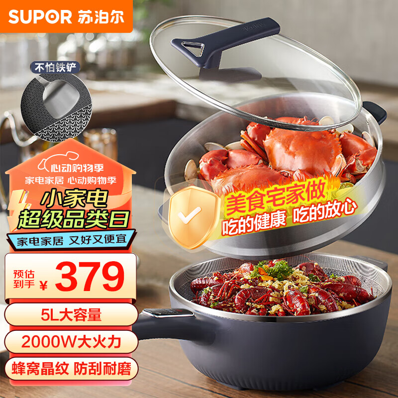 苏泊尔(SUPOR)电炒锅 电蒸锅 电煮锅 家用多功能 蒸煮炒菜电热锅 5升多用途锅 CD32A805配蒸屉价格:429.00元!
