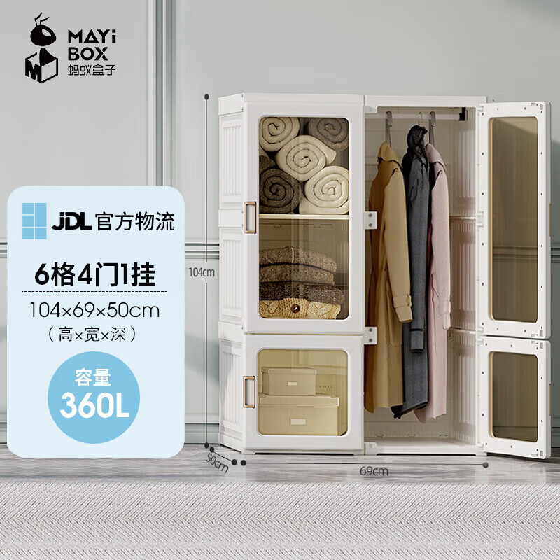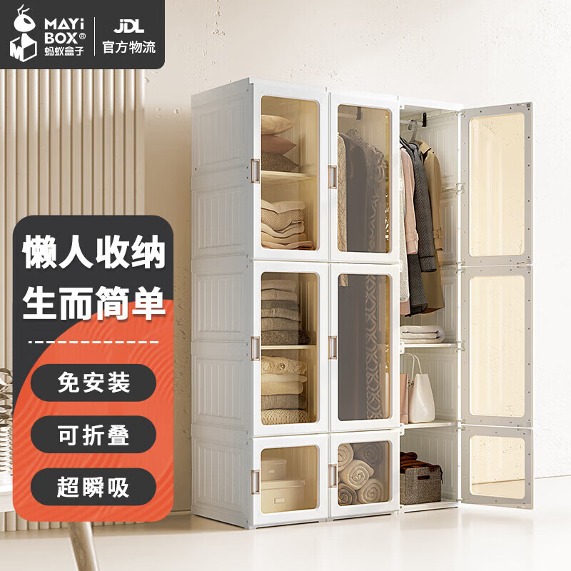 蚂蚁盒子(MAYIHEZI)免安装可折叠塑料成人简易衣柜子出租房衣服收纳防尘6格4门1挂价格:409.00元!