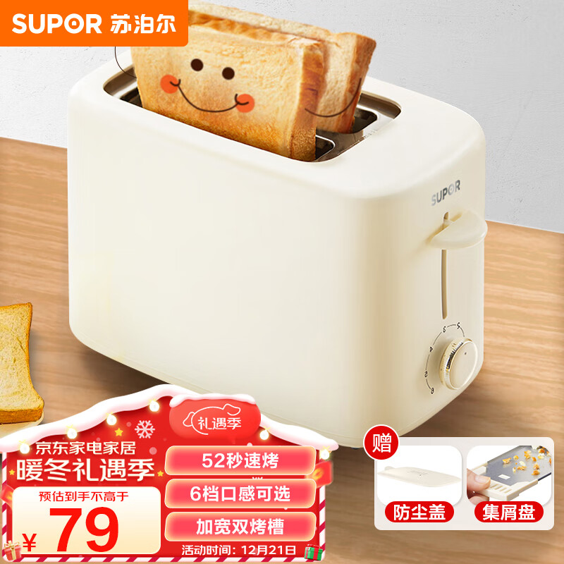 苏泊尔(SUPOR)面包机 多士炉早餐机烤吐司机 家用烤三明治面包片 2片多功能轻食机 6档烘烤 带防尘盖DJ805价格:79.00元!