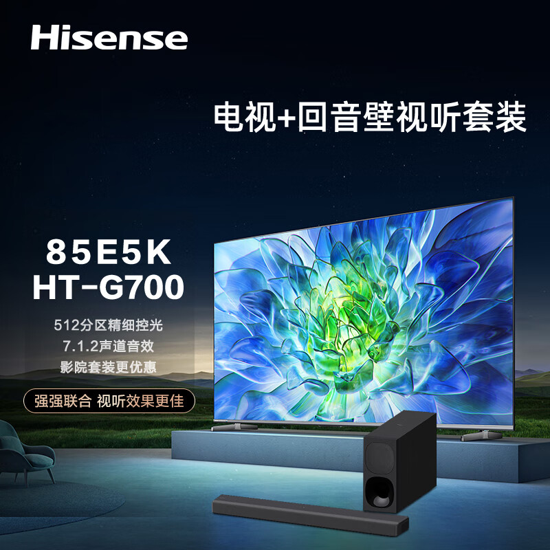 海信电视85E5K+HT-G700沉浸追剧套装 85英寸 ULED 512分区 1300nit 4K 144Hz超高清智慧屏电视机价格:10089.00元!