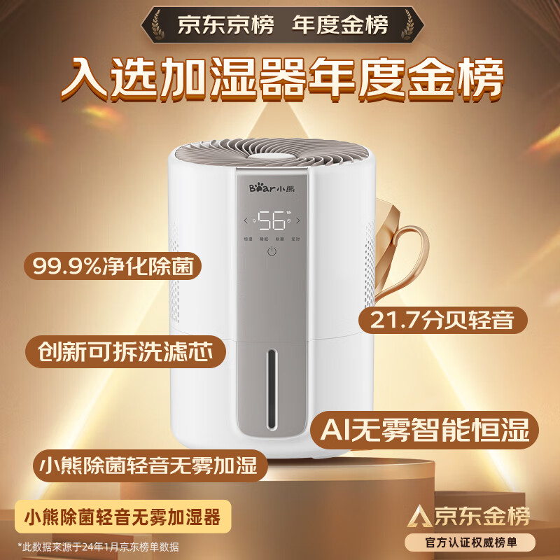 小熊(Bear)无雾加湿器 卧室轻音婴儿用办公室大容量 家用低噪智能恒湿母婴空气加湿桌面JSQ-F40J1价格:358.00元!