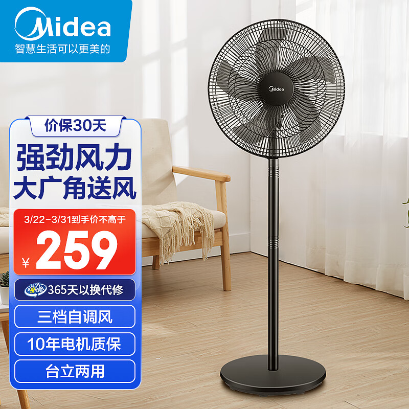 美的(Midea)台地落地扇电风扇升降扇极简加重底盘新能效黑色五叶大风量摇头两用纯铜电机电扇FSA40UE价格:259.00元!