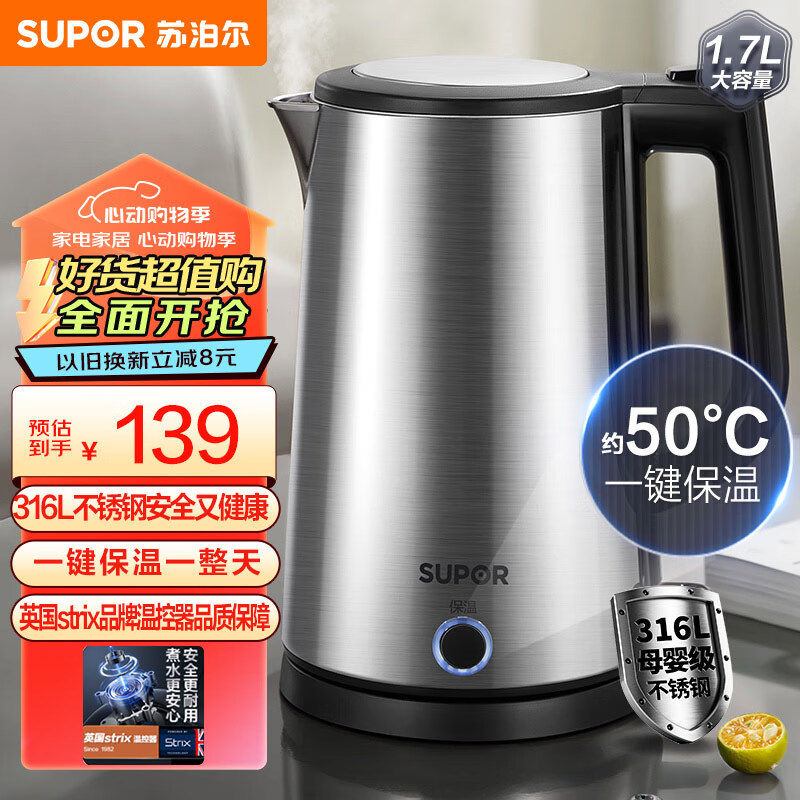 苏泊尔(SUPOR)电水壶热水壶 1.7L全钢无缝双层防烫电热水壶 316L不锈钢烧水壶 一键保温 SW-17J13P价格:139.00元!