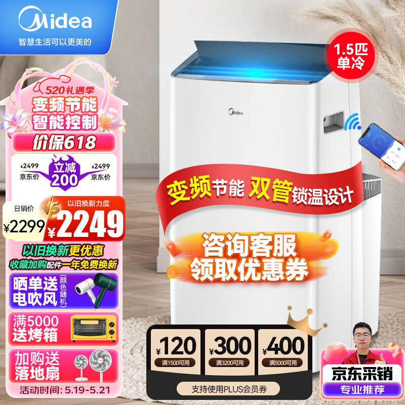 美的(Midea)移动空调1.5匹单冷变频 家用厨房空调一体机免安装免排水 KY-35/BP3N8Y-PT价格:2299.00元!