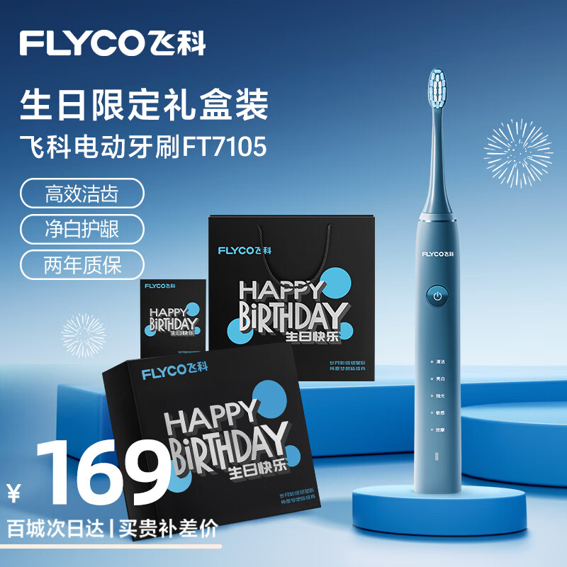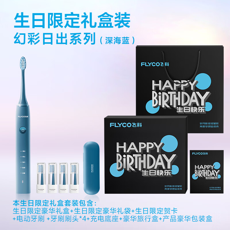 飞科(FLYCO)电动牙刷成人情侣款送男友/女友/长辈 生日礼物 智能声波震动软毛刷FT7105深海蓝-生日限定礼盒价格:177.80元!
