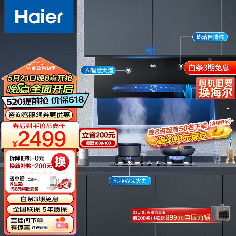 海尔(Haier)抽油烟机燃气灶 侧吸式变频烟灶套装 26立方大吸力 挥手智控 家用厨房抽烟机EC911UD+Q2BE3天价格:2699.00元!