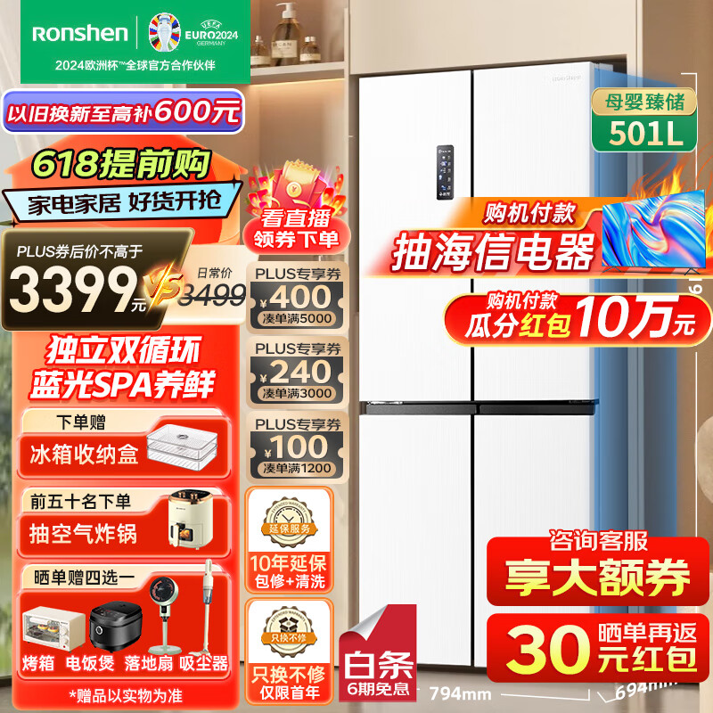 容声冰箱四开门501升蓝光养鲜嵌入式家用大容量双循环无霜一级能效冰箱白色BCD-501WD18FP[官方直发]价格:3499.00元!