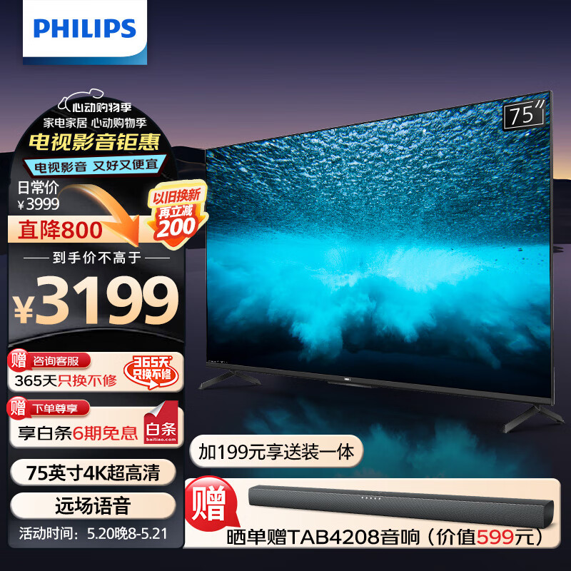 飞利浦(PHILIPS)75英寸4K超高清智慧屏 MEMC运动防抖 远场AI语音智能平板液晶电视机75PUF7297/T3以旧换新价格:3199.00元!