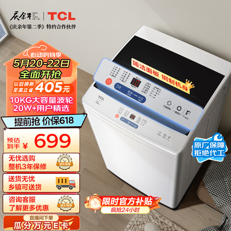 TCL 10KG大容量波轮洗衣机L100 四重智控 一键脱水 洗衣机全自动家用 以旧换新 宿舍租房神器B100L100价格:699.00元!