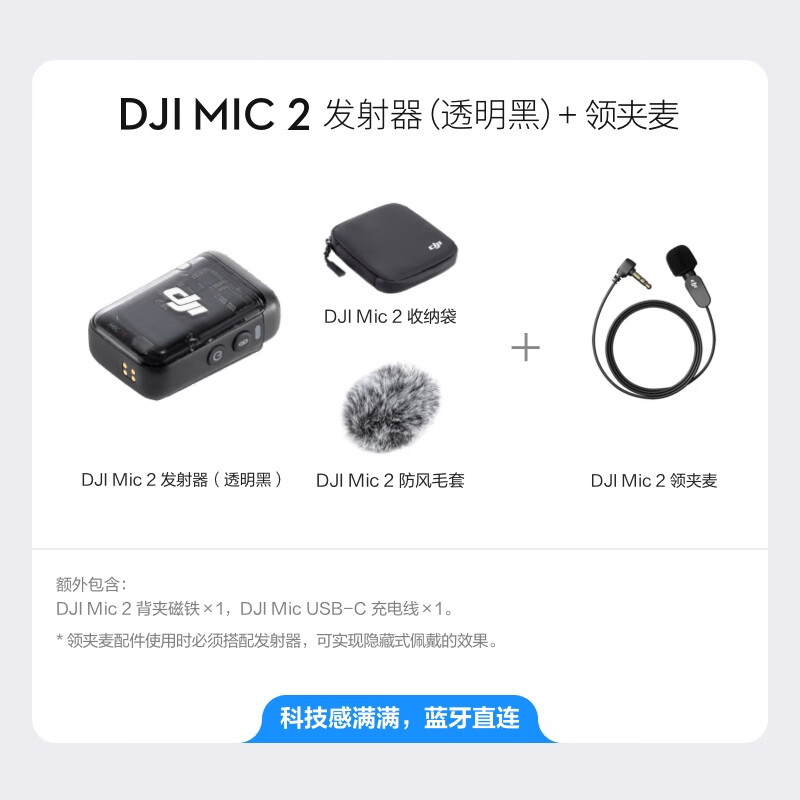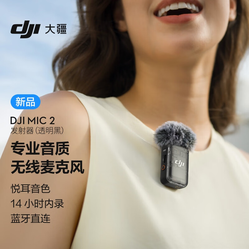 大疆DJI Mic 2 发射器(透明黑)专业音质无线麦克风 智能降噪 蓝牙直连 无损内录+领夹麦价格:898.00元!