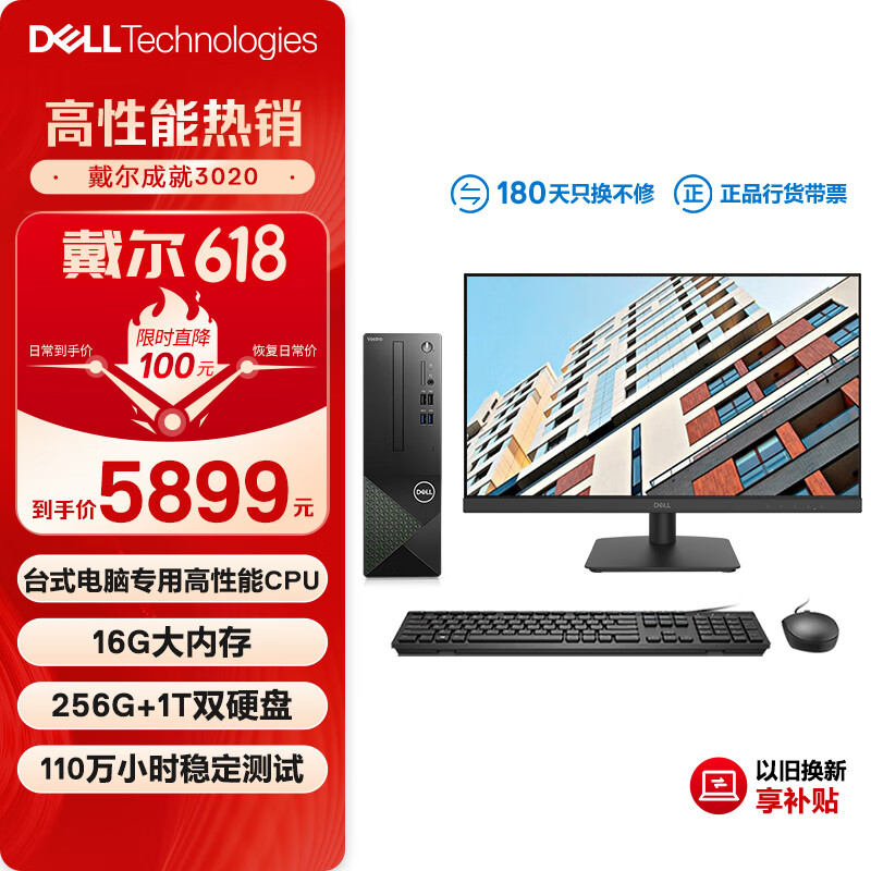戴尔(Dell)成就3020 台式电脑主机(酷睿13代i7-13700 16G 256GSSD+1TB)23.8英寸大屏显示器 高性能CPU价格:5899.00元!