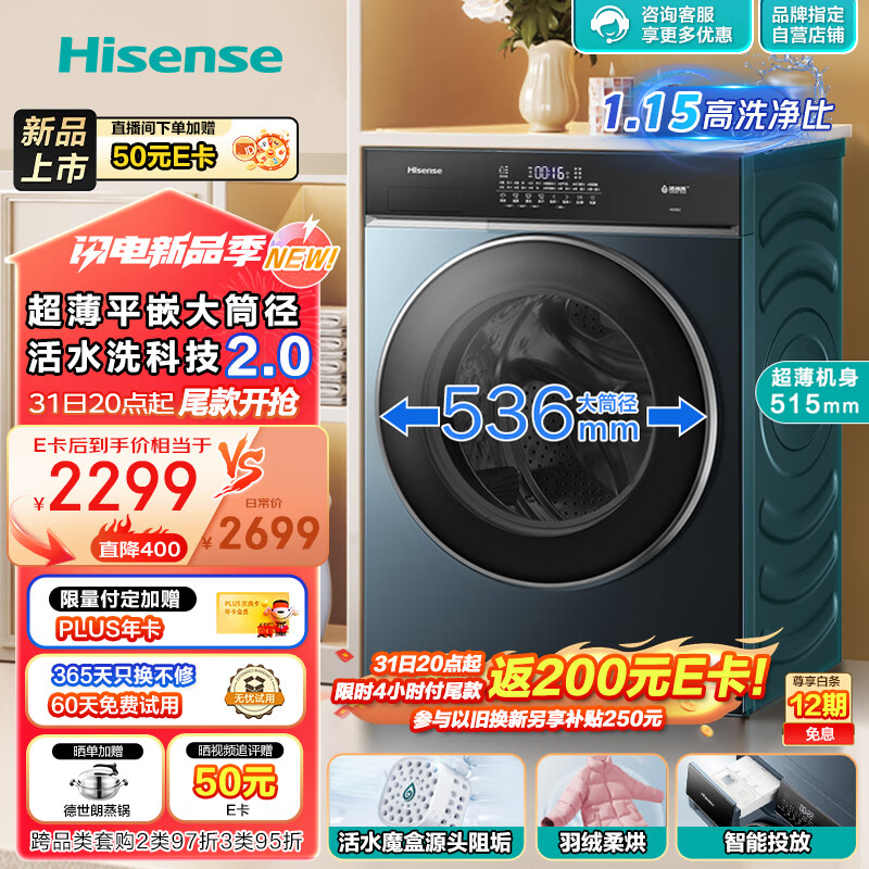 海信(Hisense)滚筒洗衣机全自动 10公斤洗烘一体大筒径超薄平嵌 1.15高洗净比活水洗2.0 智能投放 HD10IE2价格:2499.00元!