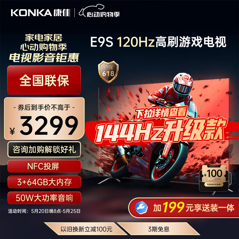 康佳电视 75E9S 75英寸 3+64GB 120HzMEMC高刷护眼 4K超清屏投屏 智能语音液晶平板电视机以旧换新价格:3399.00元!