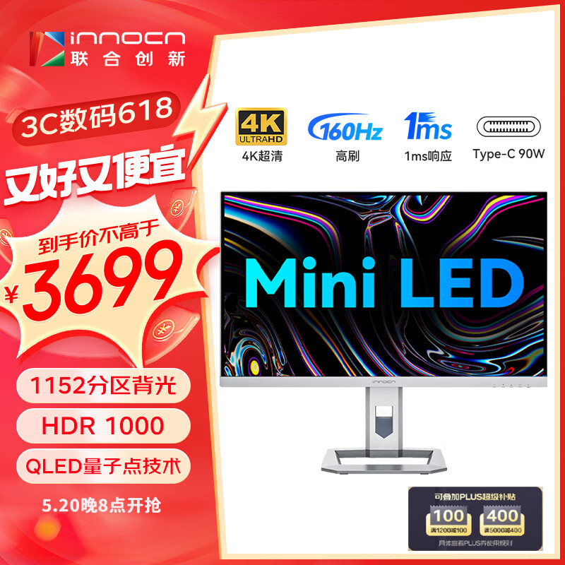 联合创新(INNOCN)27英寸4K 160Hz MiniLED显示器1ms自动感光护眼Type-C90W旋转升降HDR1000电脑显示屏27M2V价格:3699.00元!