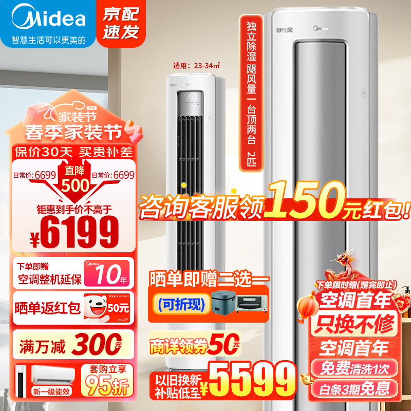 美的(Midea)空调 2匹 静优风 新一级能效 变频冷暖 除湿 空调立式 客厅空调立式柜机 [KFR-51LW/N8HY1-1]价格:6199.00元!