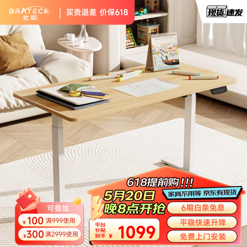 Brateck电动升降电脑桌 北弧站立办公升降书桌 工作升降台 K2黄1.5米价格:1399.00元!