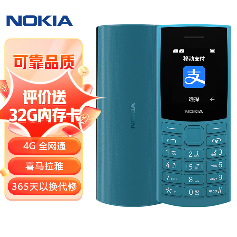 诺基亚NOKIA新105 4G 【2023款】通移动联通电信 老人老年按键直板学生儿童备用手机 双卡双待蓝色价格:199.00元!