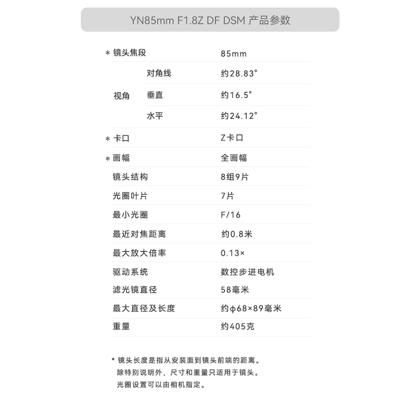 永诺YN85mm F1.8Z DF DSM配置参数: