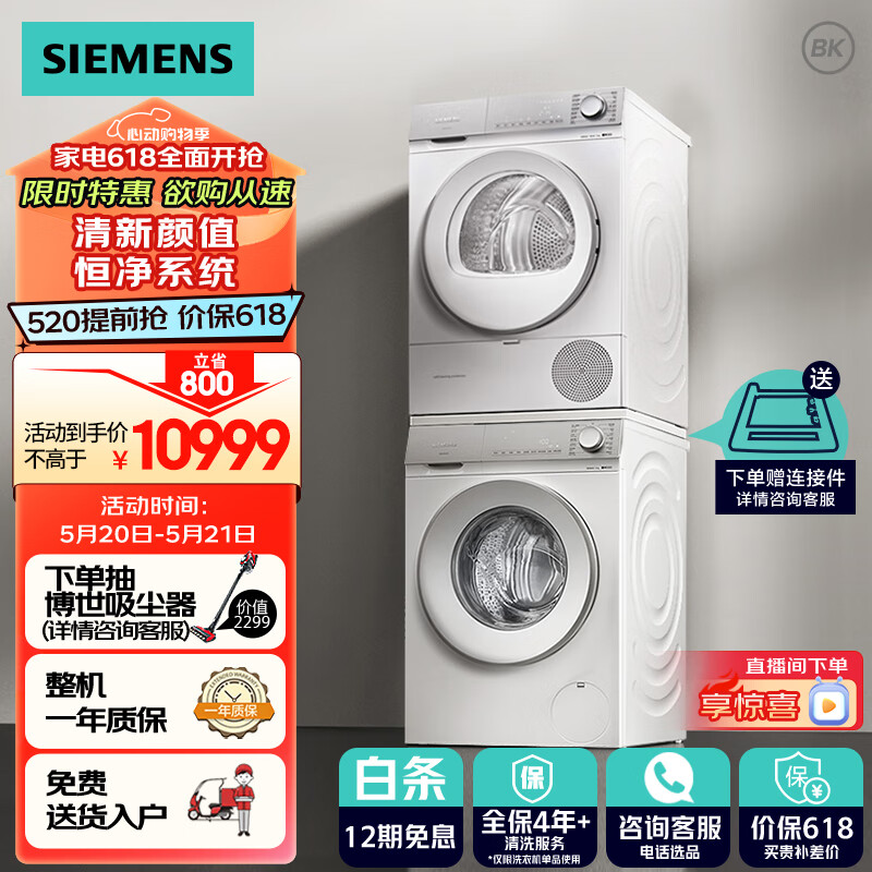 西门子(SIEMENS)轻颜洗烘套装 10kg智能除渍滚筒洗衣机全自动+10kg热泵烘干机家用 WG54B2X00W+WQ55B2D00W价格:11799.00元!