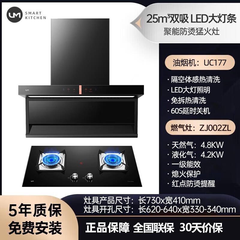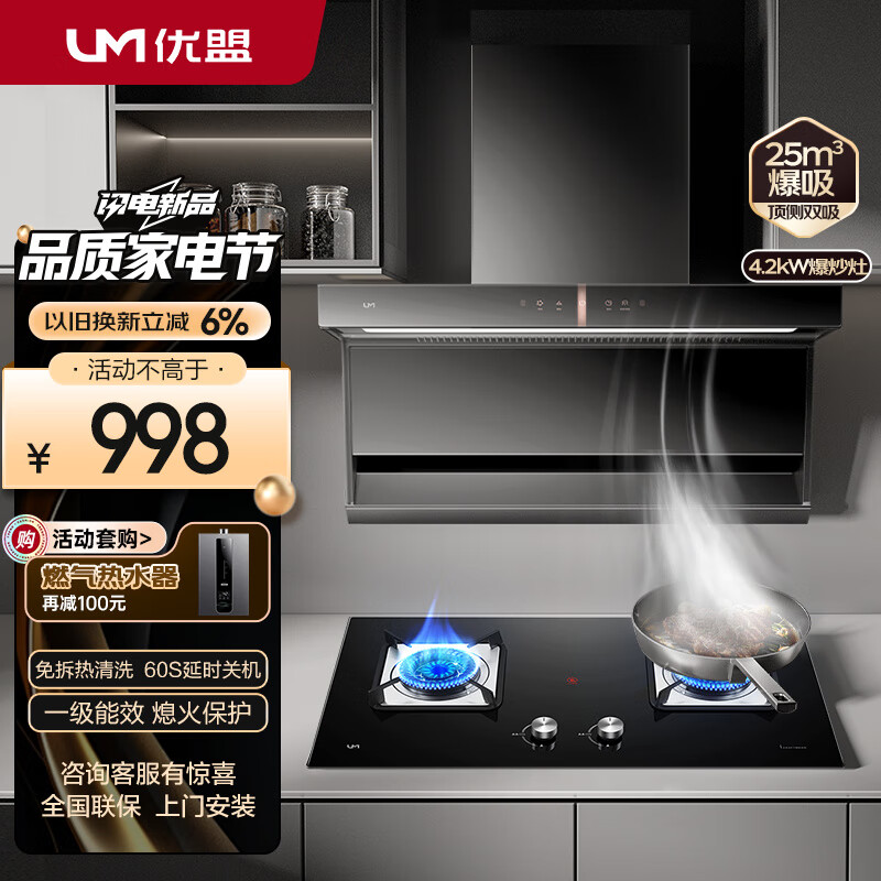 优盟(UM)顶侧双吸油烟机7字型抽油烟机灶具套装 家用厨房大吸力油烟机燃气灶套餐 M06系列(液化气)价格:1348.00元!