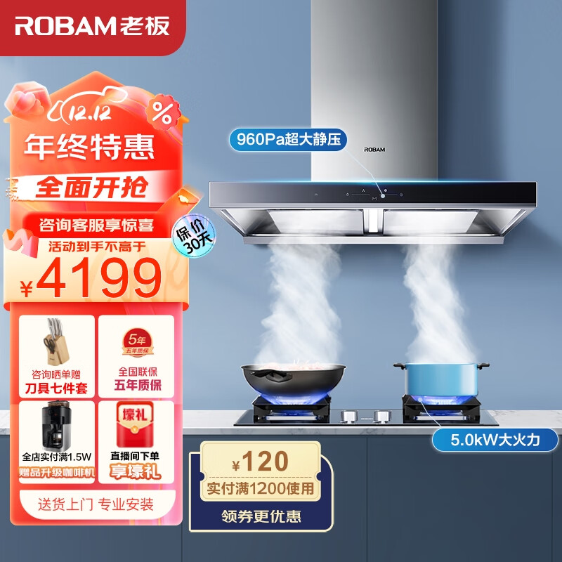 老板(Robam)抽油烟机 领航家D1S双腔变频吸油烟机家用烟灶套装22m3/min燃气灶60D1S+57B2DY液化气价格:4199.00元!